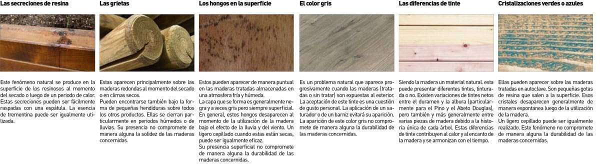 En ningún caso esta garantía cubrirá desperfectos naturales de la madera tales como: grietas, fendas o rajas de diversa consideración; secreciones de resina; hongos superficiales; coloración grisácea; cristalizaciones verdes o azules propias de las sales de cobre; diferencia de tintes. Estas últimas, se deben a las tablillas que se utilizan para separar el material cuando se trata en Autoclave. Así mismo, el tiempo de exposición de la madera al exterior, es un factor que influye en su coloración. De todas maneras, estas diferencias de tinte, contribuyen al calor y encanto de la madera y se armonizan con el tiempo.